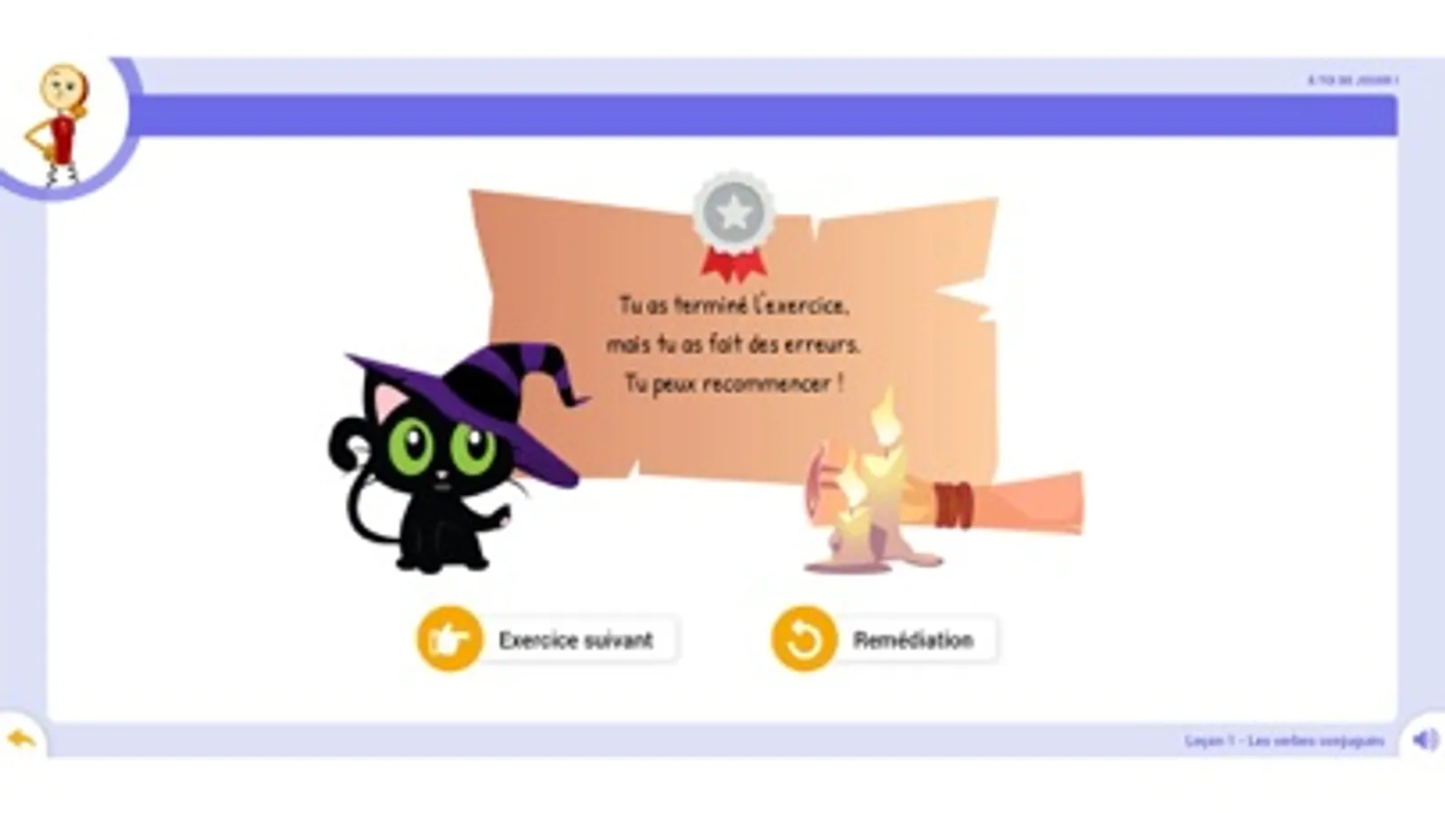 • « À toi de jouer » : 2 exercices interactifs d’entrainement par leçon. Dix questions ou phrases s’enchainent ; l’élève observe sa progression représentée par des pastilles de couleurs correspondant à sa réussite. Ces exercices sont conçus pour une utilisation individuelle et peuvent être imprimés.