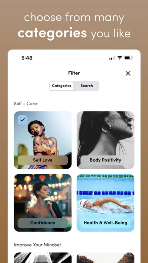 Choose what you want to change in your life from tens of categories, including self-love, body positivity, health, well-being, self-esteem, relationships, career, mindset, stress, anxiety, mindset, and much more.