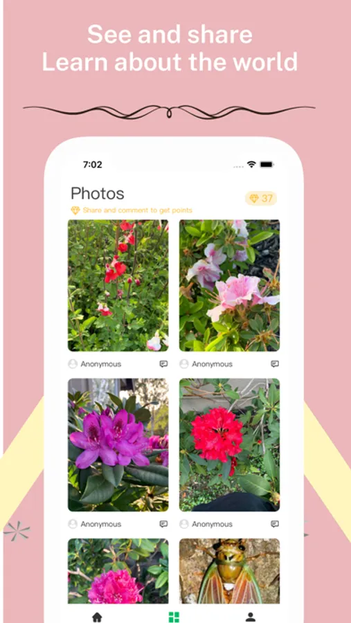 Take photos to identify plants, animals, wine, calories, cars, fruits and vegetables. Share the identification results to learn together and get points.