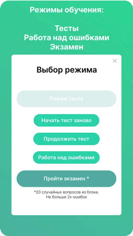 - Режим экзамена - проходите экзамен, тестирование по случайному набору из 20 вопросов, можно допустить не более 2ух ошибок