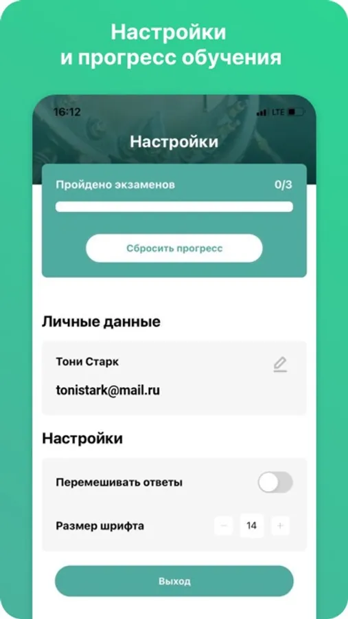 - Прогресс - просматривайте шкалу прогресса по всем пройденным Экзаменам и Тестам