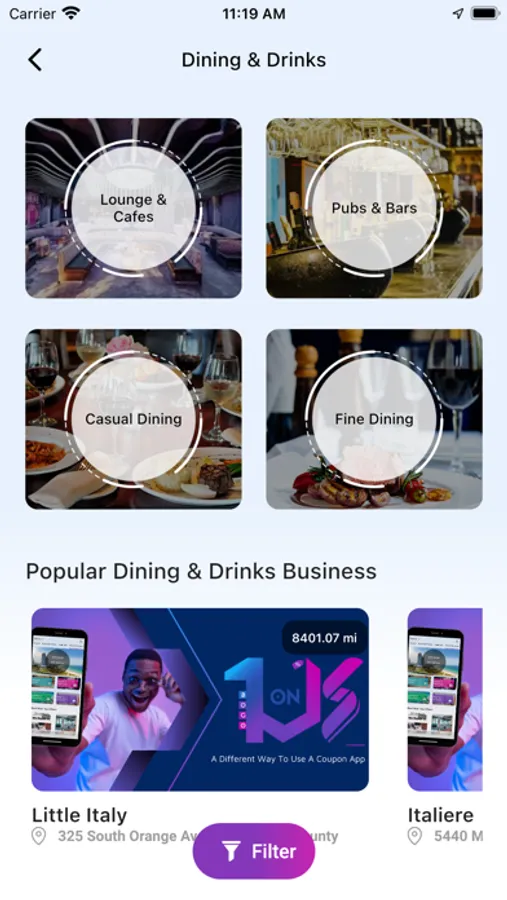 1ONUS is an App designed to be a platform that connects both users and merchants through Buy-One-Get-One deals and discount coupons in dining, entertainment, fitness, beauty, and other goods and services. With a yearly membership, the user can take advantage of Exclusive Deals only found on 1ONUS! Our main focus is to connect users of the App to great merchants in local areas that may not be offered the exposure they deserve. For convenience, we comprised a list of Happy Hours in your area.