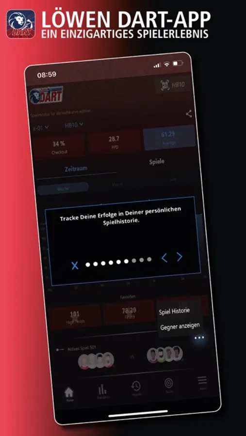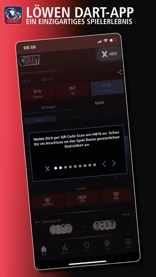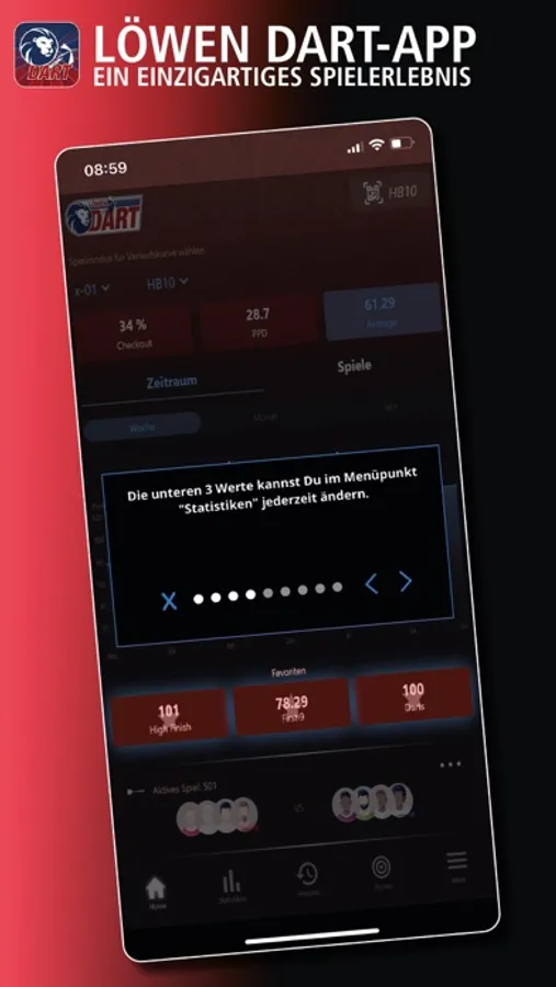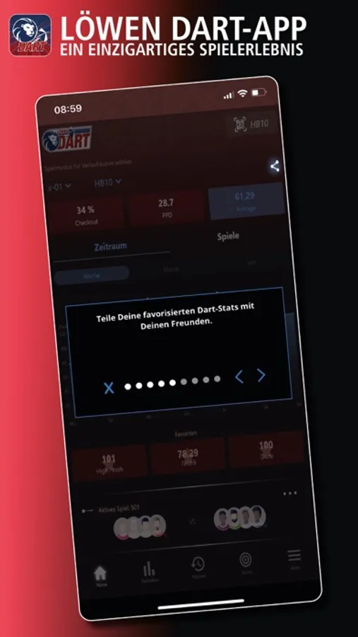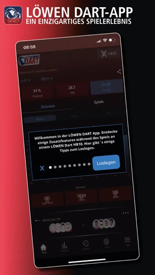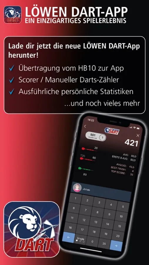 Mit der LÖWEN DART-App erhältst du individuelle Statistiken zu deinem Spiel und kannst Trainingserfolge ganz einfach mit Freunden teilen.