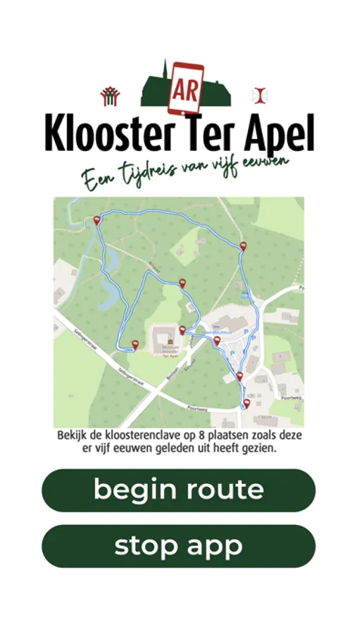 Een wandelroute om het Klooster Ter Apel waarbij op 8 punten in de route een virtuele tijdreis gemaakt kan worden. U kijkt via uw telefoon of tablet op deze 8 punten in 360 graden terug naar hoe de plek er vijf eeuwen geleden uit heeft gezien.