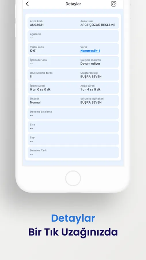- Arızalarınız için saniyeler içerisinde iş emri oluşturabilir ve ilgili yetkililere bildirim gönderebilirsiniz.