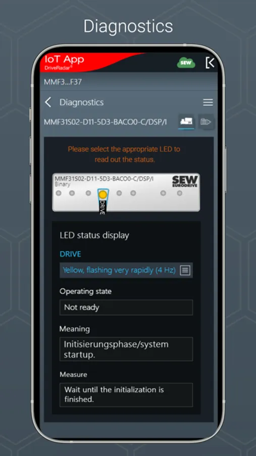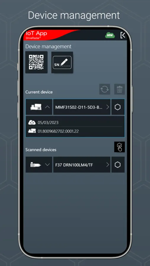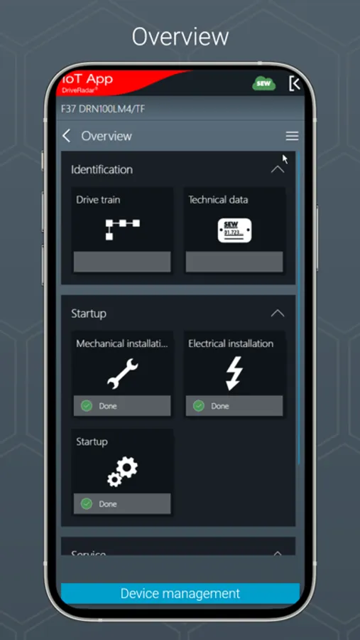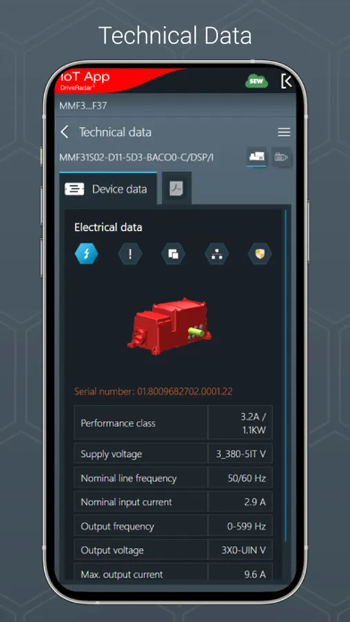 The IoT app is the mobile assistant for all tasks throughout the entire product life cycle of an SEW product. The app provides support from installation to startup to maintenance and delivers all technical data and work packages step-by-step and product-specific.
