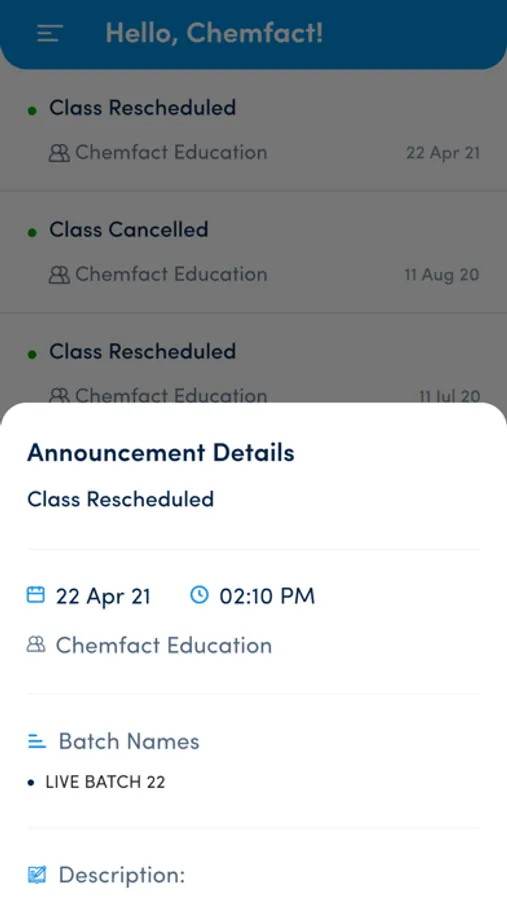 The official Chemfact Application. It offers students a wide variety of courses offered by Chemfact Education. Students can use the application to access these courses, distributed to multimedia content like videos, pdf's and much more