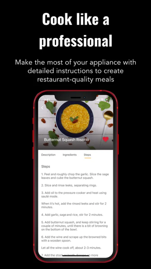 Once you have downloaded the app, pair your TEAM CUISINE smart kitchen appliances to your smartphone via wireless connectivity. You can then access our recipe library and control cooking right from your phone.