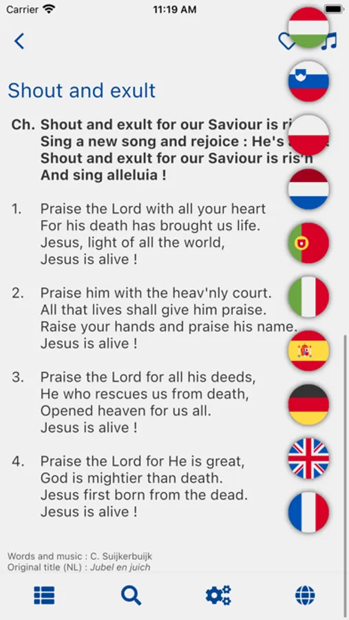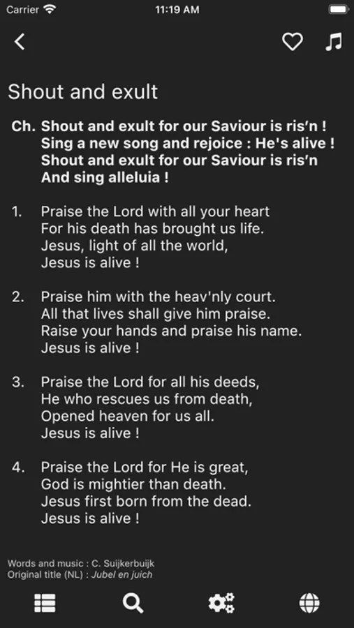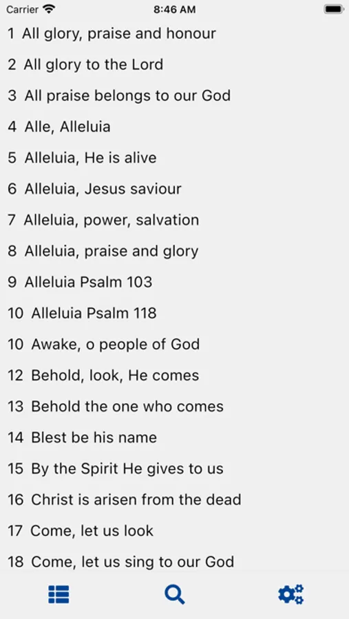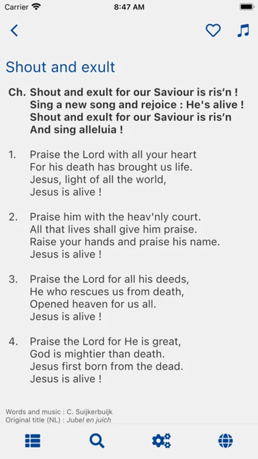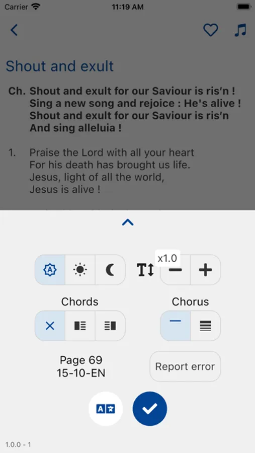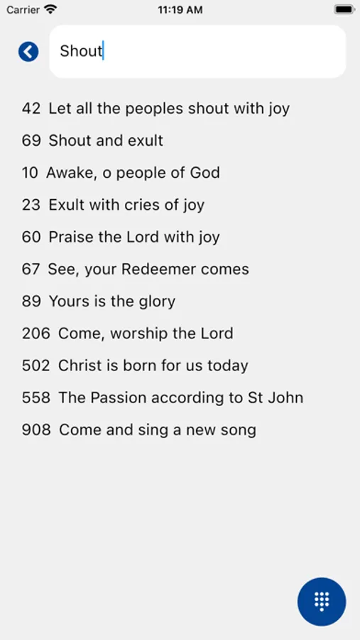 Optimize your searches thanks to the search by category of the songbook (praise, hope and trust, Mary, etc.), by page of the physical songbook, or by song title.
