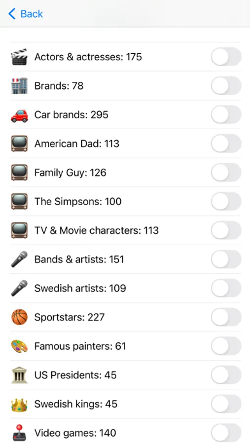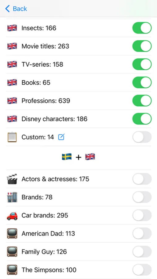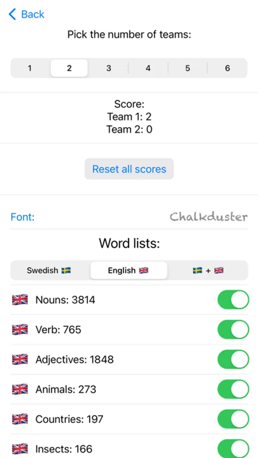 The app contains over 10000 words that are divided into different categories that can be toggled on or off at your leisure. If the word lists still aren't enough there's also the possibility of adding your own custom wordlists.
