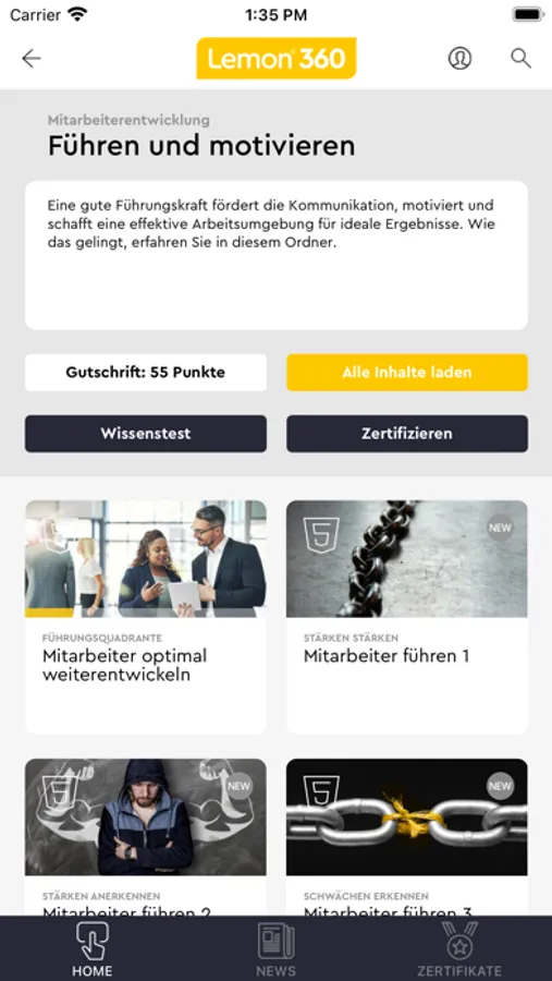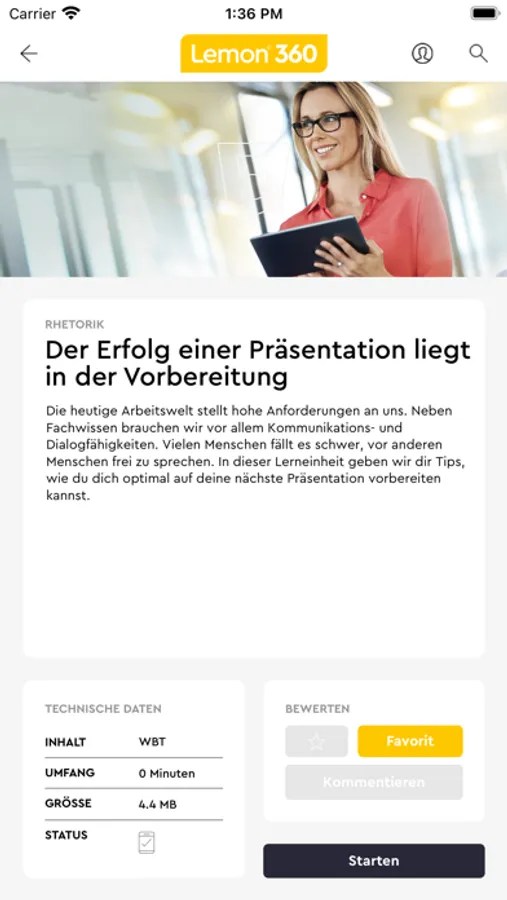 Lemon360 ermöglicht modernes, mobiles Lernen. Wissen on demand. Kompakt und komprimiert. Inhalte, Ordner und News, Web Based Trainings und Podcasts stehen Ihnen mobil in bester Performance zur Verfügung. Alle Inhalte werden übersichtlich und intuitiv präsentiert. Mit interaktiven Wissenstests und abschließenden Lernerfolgskontrollen können Sie Punkte sammeln und Erlerntes überprüfen und festigen.