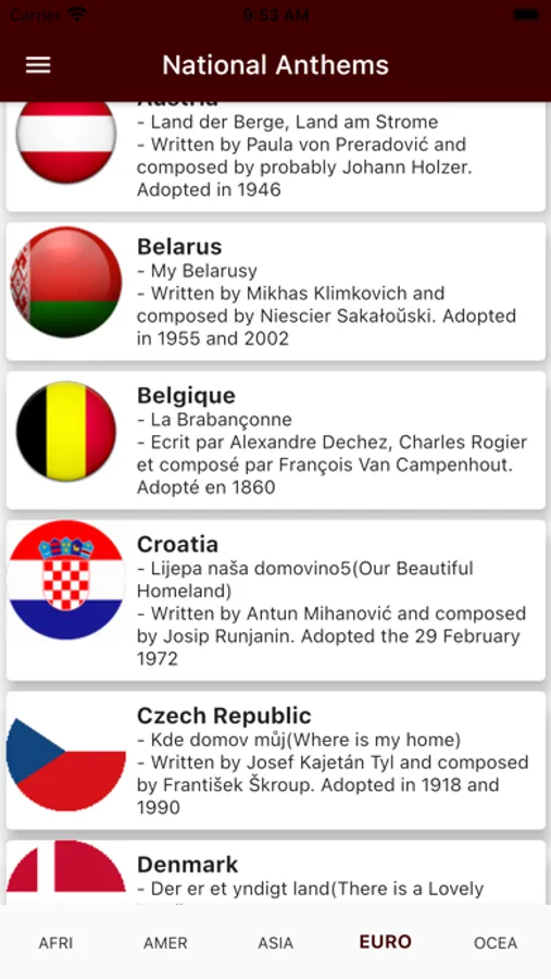This application allows you to know the national anthems of the countries of the world in words and in music. It also lets you know the authors and the year of adoption of these national anthems.