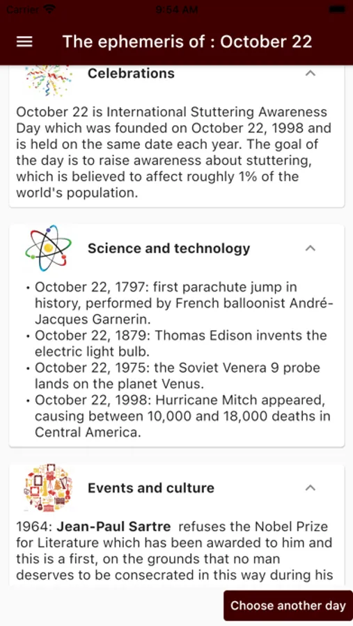 This application also allows to know the historical events of the world in several fields such as science, culture, religion.