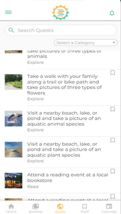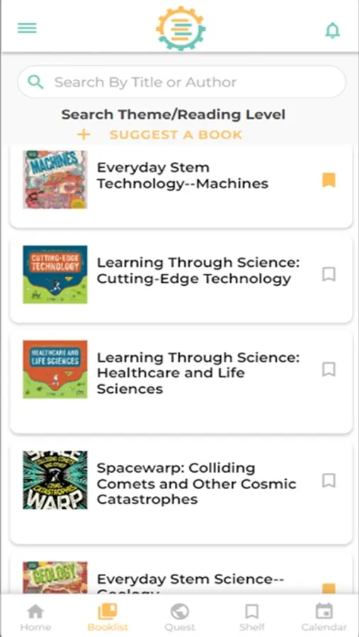 The app features two primary lists: STEM Reads Booklist and the STEM Quest Tasks. Users can bookmark items from each list, add them to a private calendar, mark them off as completed, filter them by STEM theme, and even create or upload private notes, images, or videos.