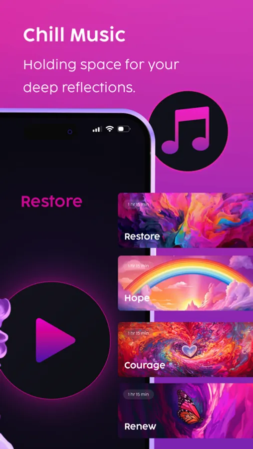 If you’re looking for an easy and relaxing audio experience with no narration, scroll to the “Chill Music” channel on the home screen or use the ‘Music Only’ shortcut at the bottom of the Journey Macrodose players. The Chill Music player has you covered with up to 30 minutes of continuous playback with different vibes and soundscapes to suit your needs.