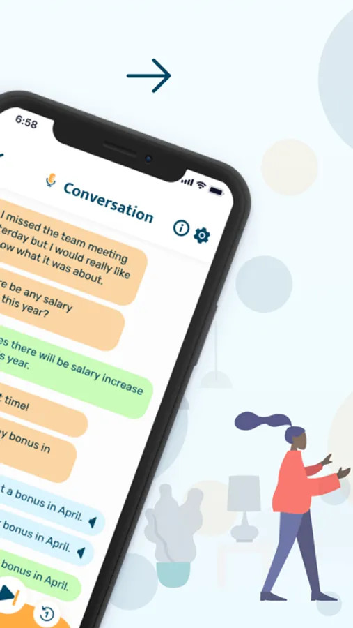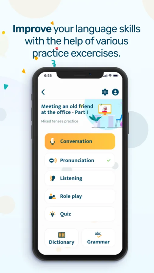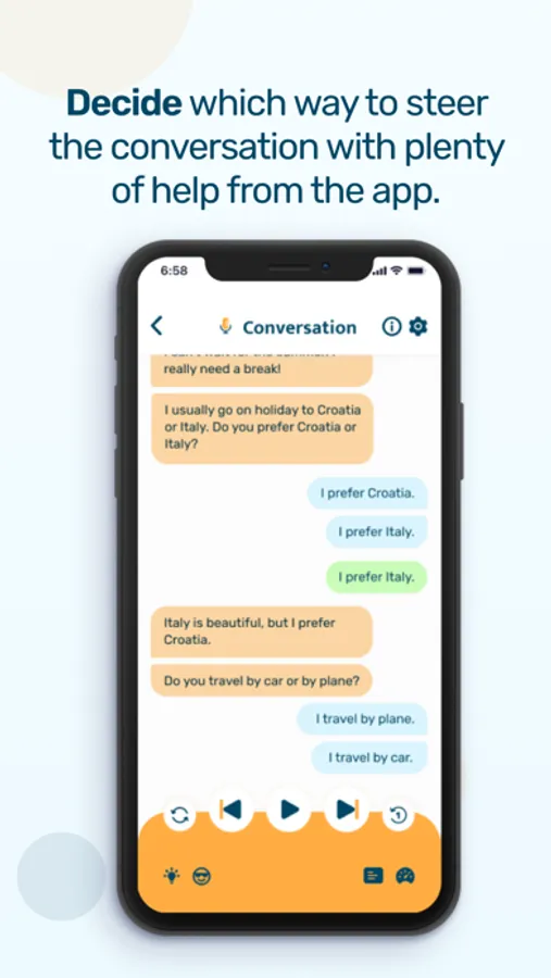 You can read possible responses and listen to them spoken by native English speakers if the ‘voice hints’ function is enabled. Besides voice hints, you can get more suggestions for possible responses by tapping on the lightbulb icon. Our AI bot even keeps an eye on correct grammar and pronunciation when ‘fixed’ mode is on, and it’ll ask you to repeat your answer if it detects a mistake or poor pronunciation. No need for embarrassment here—just guaranteed improvement!