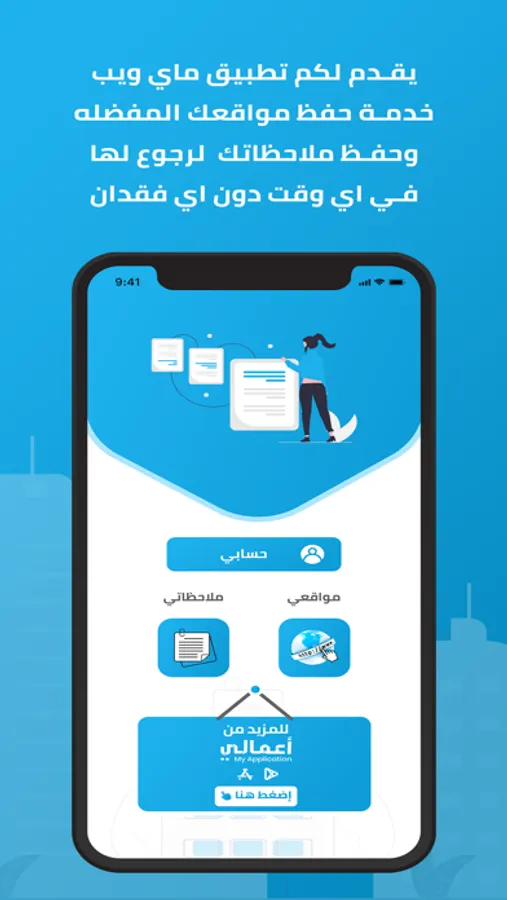 يقدم لكم تطبيق ماي ويب خدمة حفظ مواقعك المفضله وحفظ ملاحظاتك لرجوع لها في اي وقت دون اي فقدان ومن مميزات التطبيق :