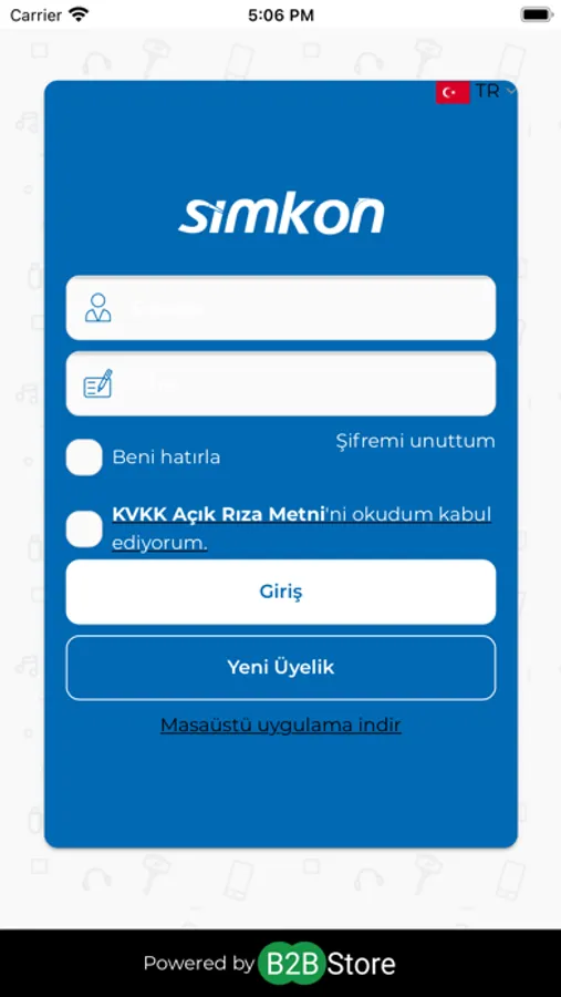 Simkon B2B'ye üye iseniz, ek bir işlem yapmaya gerek kalmadan, uygulamayı indirip kurduktan sonra kullanıcı adı ve şifrenizi girerek sisteme giriş yapabilirsiniz.