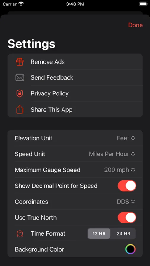 Speedometer has large fonts and supports mph, km/h, and knots speed display. The app also shows the traveled distance. Average and maximum speed is displayed in an optional screen as well.