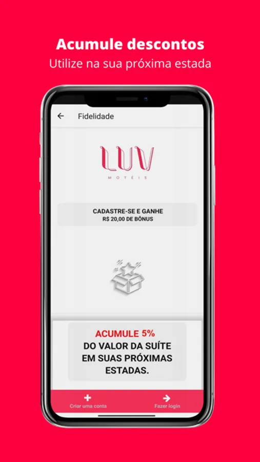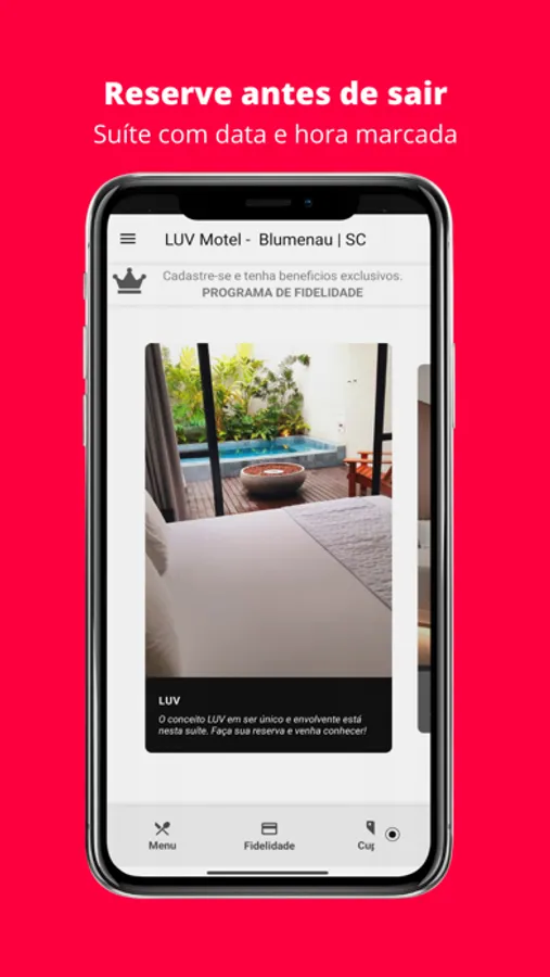 Baixe nosso App, faça seu cadastro e ganhe um crédito para utilizar na sua primeira reserva. Ir ao Luv Motel nunca foi tão fácil. Você reserva a sua suíte antes de sair de casa, do trabalho ou da balada, acumula descontos para utilizar na sua próxima estada e muito mais.