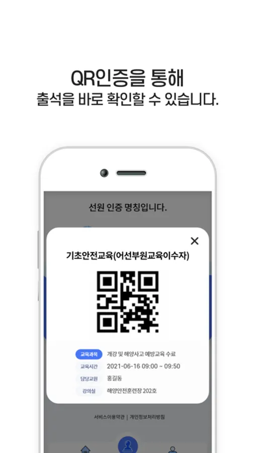 : 출석 QR 생성, 승선명단 확인 등 기관별 주요기능을 첫 화면에서 바로 접근하실 수 있습니다.