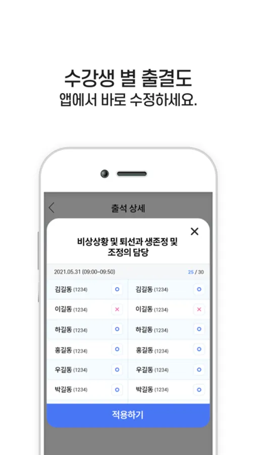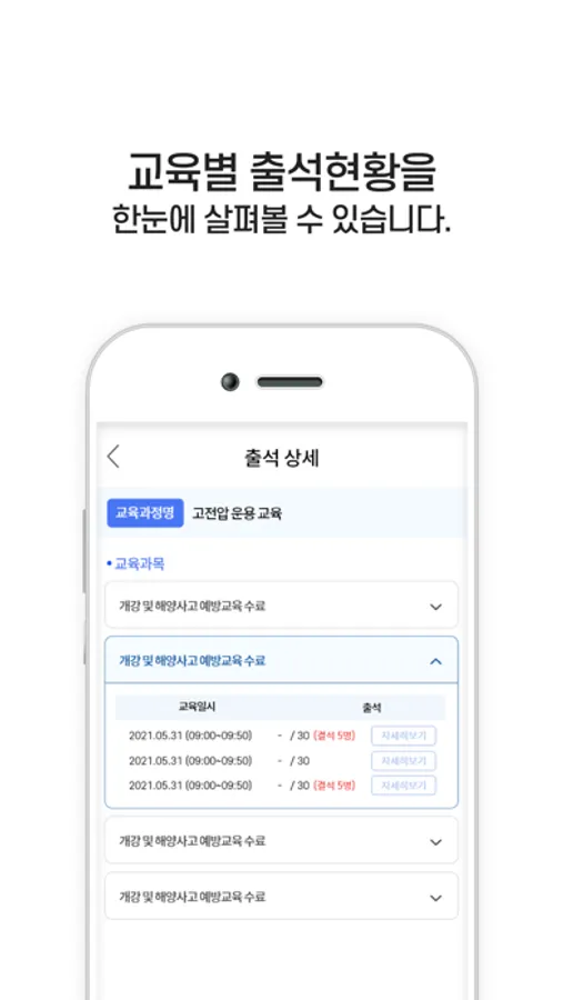 : 교육 과목별 상세 출석내역을 확인하고 출결을 수정하실 수 있습니다.