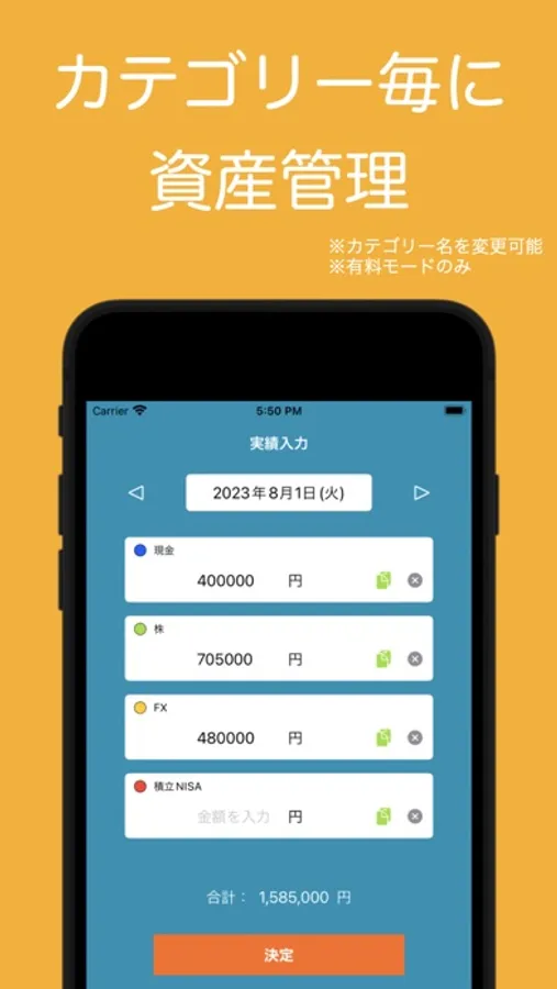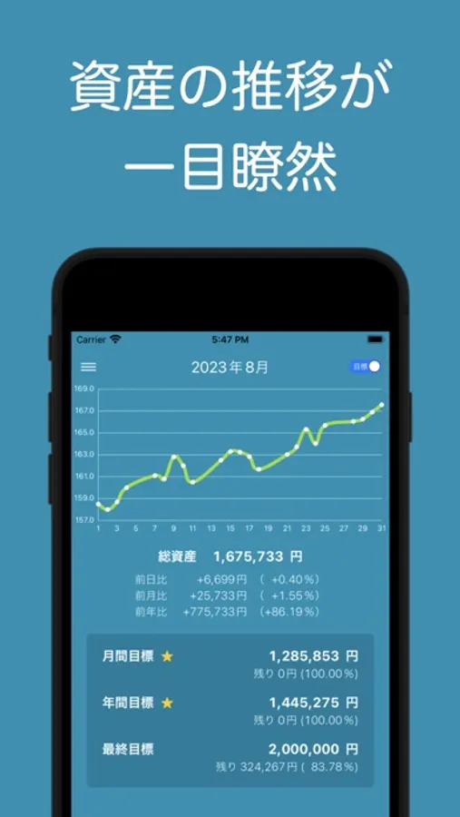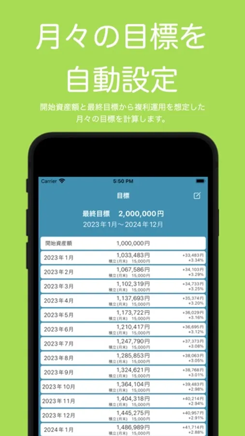 ・開始額、最終目標額、期間(最大1年)から月毎の目標額を算出