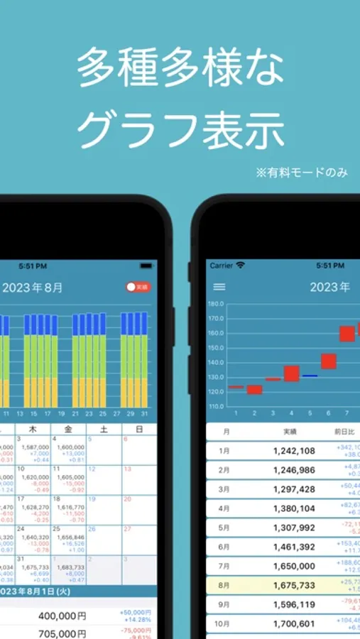 ・月毎の資産推移をグラフ表示(棒・棒(割合))