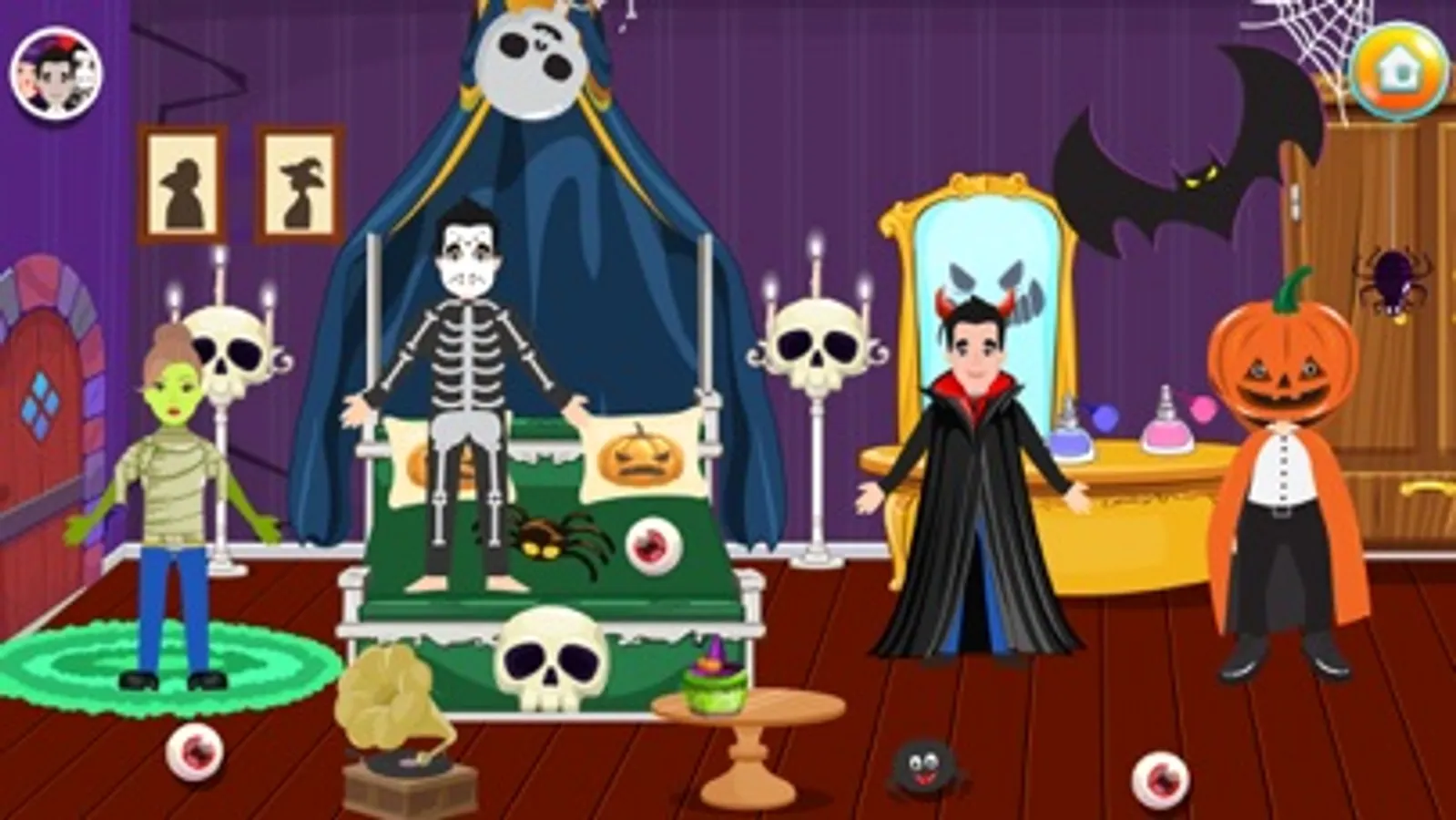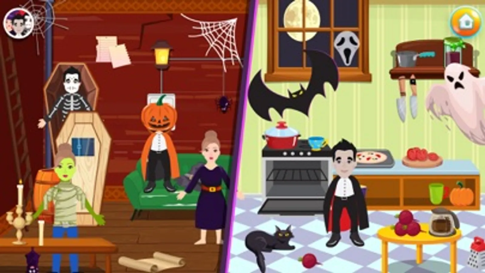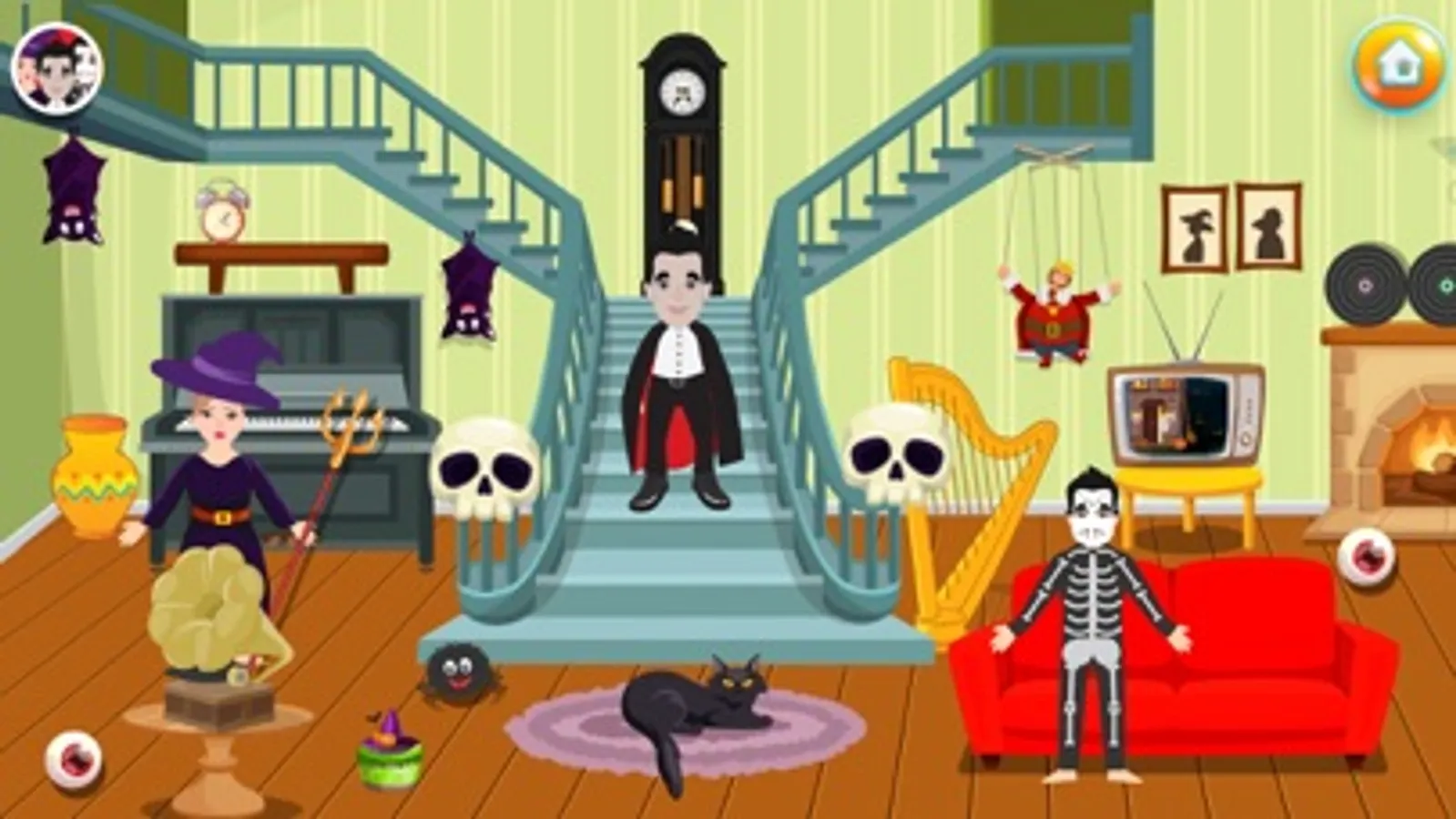 This Halloween celebrate a party with your family and friends. In most spooky house in town, make your own stories play with your favorite characters in this haunted house game. Enjoy playing this super fun game let your kid write his/her stories with fun characters in this pretend play haunted house game.