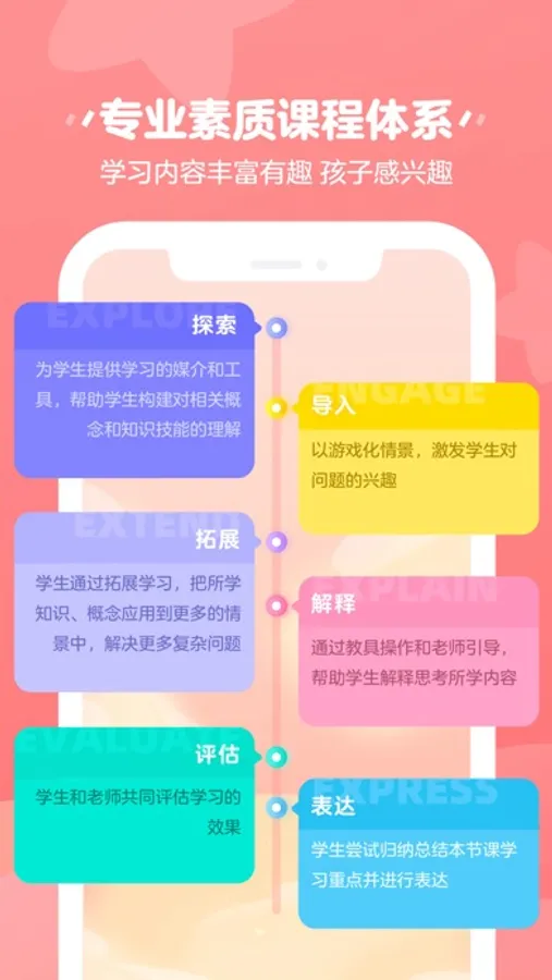 我们秉承科技赋能教育,专业引领未来,基于认知心理学、脑科学及核心素养等专业研究,参考中国学生发展核心素养及课程标准,研发符合孩子年龄特点及发展需求的专业内容,包括但不限于:益智探索,口才表达,美术审美、科学编程、音乐素养等,借助多媒体互动游戏开创学习新体验,采用前沿教玩具启发多元智能,引入国内外先进学习工具,结合PBL教学法,让孩子在自我探索主动表达的过程中激发学习兴趣、培养独立思考的意识和能力,同时在实践中不断提升解决问题的能力和多元开放的创新能力。