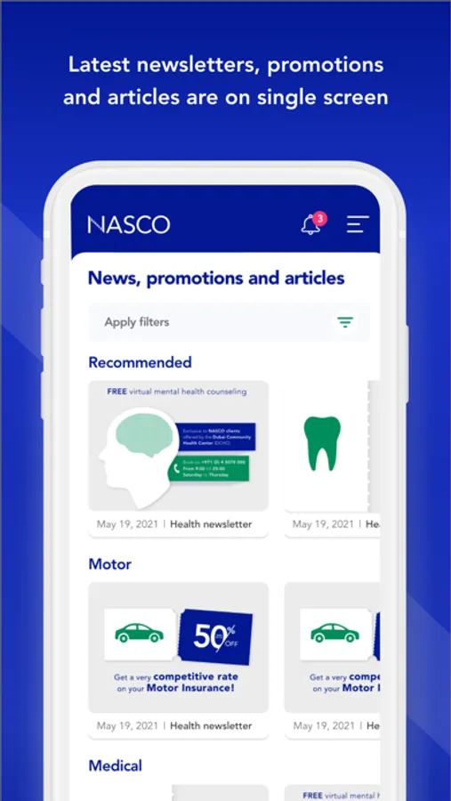 Articles and bulletins related to health, wellness and other insurance related topics are available inside the app, along with various offers and promotions for the users. Nasco Connect recommends you suitable insurance products based on your profile and saves you time.