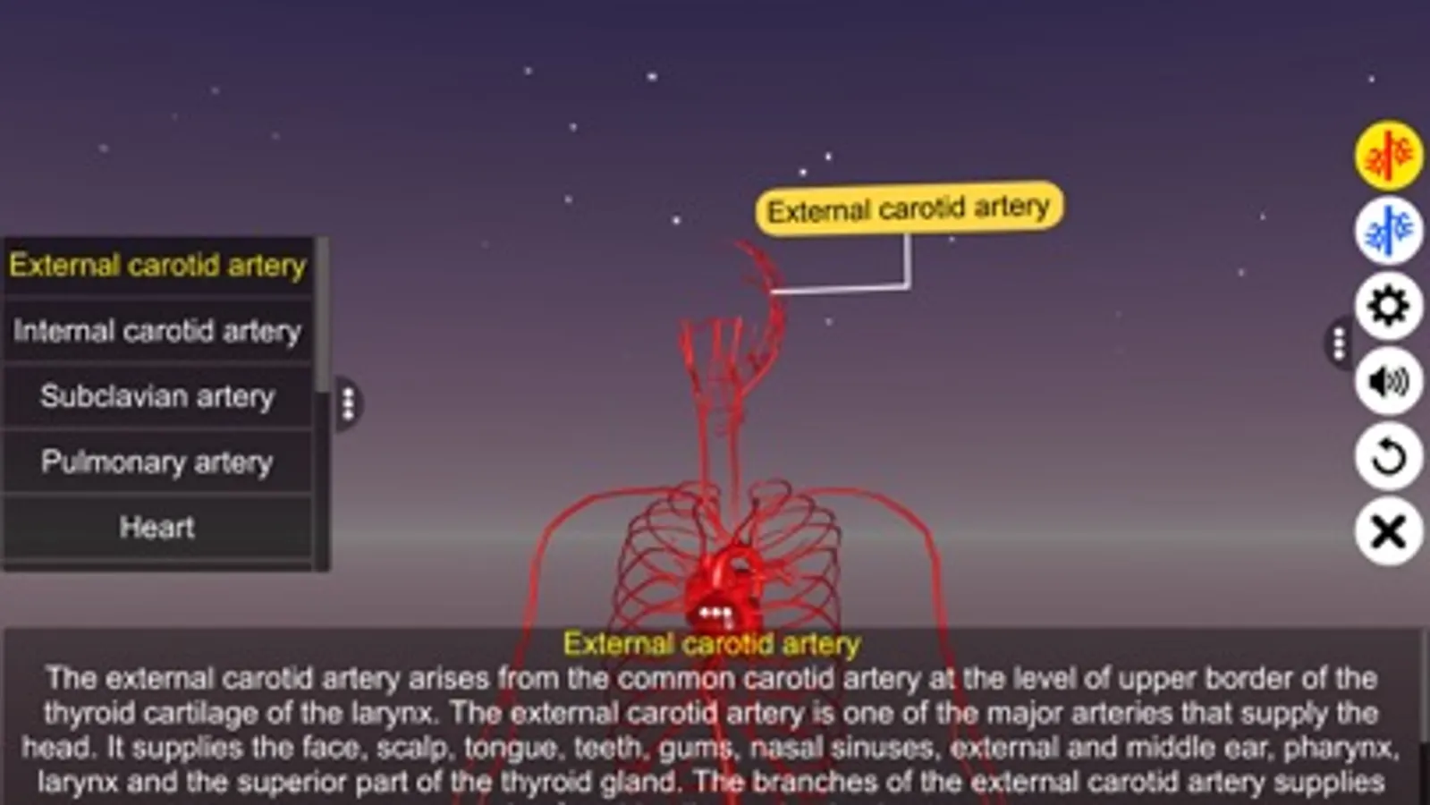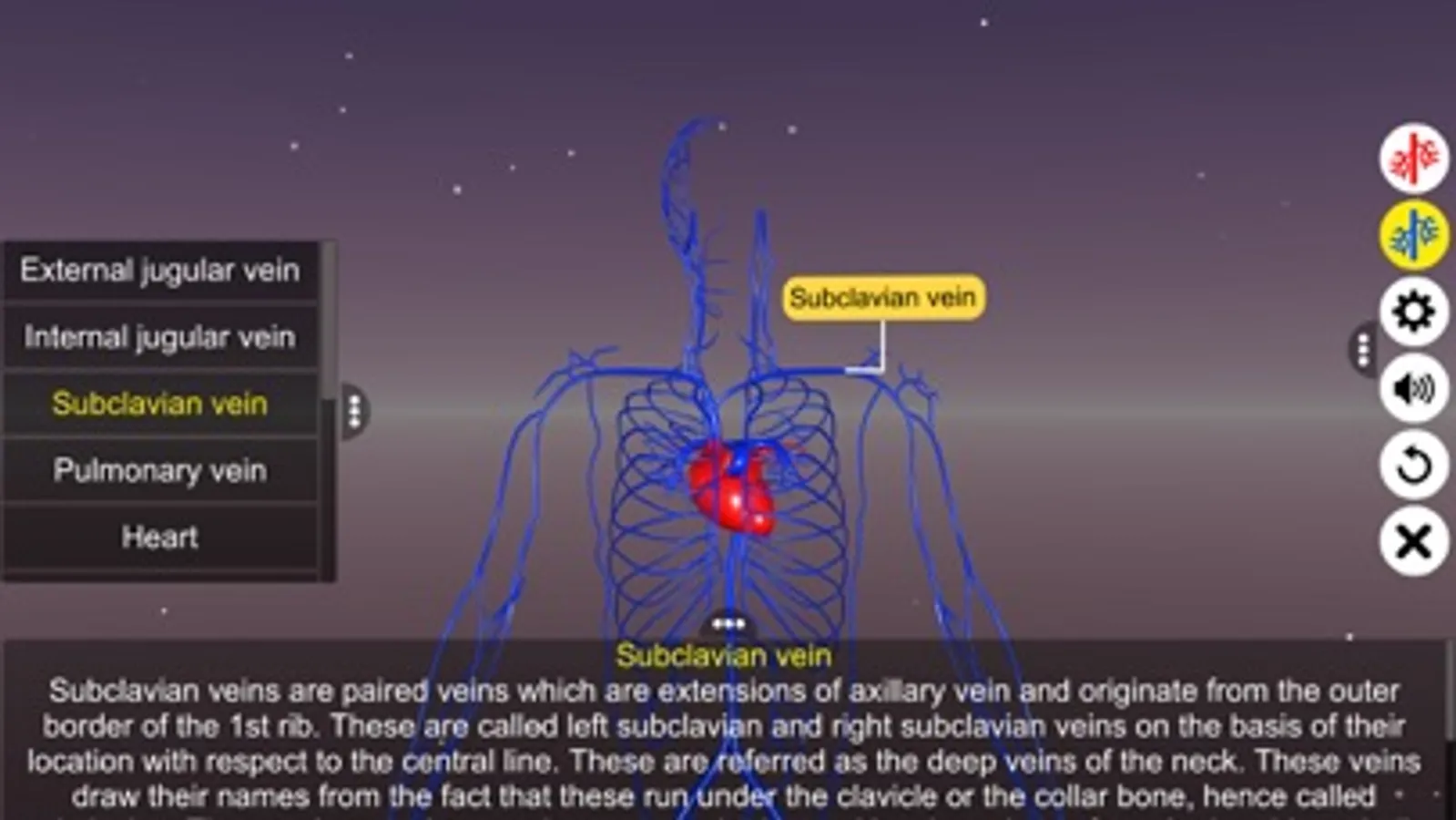 It shows a three-dimensional model of the circulatory system and a description of all of them.