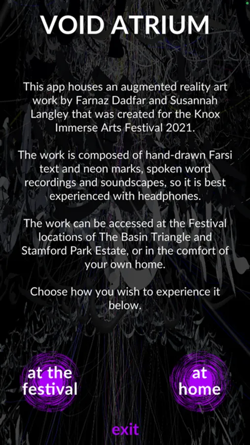 Originally designed to be explored as part of the Immerse Festival in the City of Knox, Void-atrium is a mystical artwork that invites audiences to wander through hand-drawn Farsi text, neon-lines, and soundscapes in public and private spaces via an augmented reality mobile app.