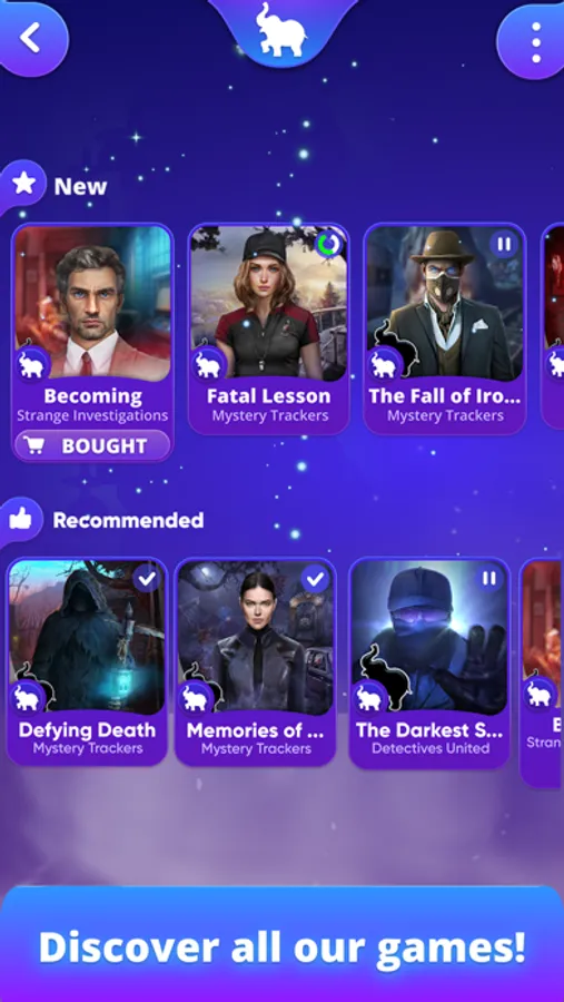 Premium Hub allows you to keep all Elephant’s games in one app. It’s a new way of enjoying the stories and uncovering all the mysteries - Chimeras, Christmas Stories, Crossroads, Cursed Fables, Detectives United, Grim Tales, Haunted Hotel, Mystery Trackers, Paranormal Files - all your favorite series in just one place. Are you ready to join in?