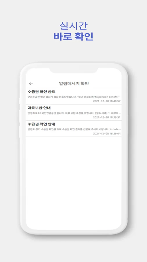 본 앱은 생체인증을 통한 본인 확인 서비스와 모바일 서류 제출 서비스 등을 제공하여 해외수급자 분들이 언제“ , ”어디서든“ 국민연금 수급권 변동사항을 손쉽게 공단에 알릴 수 있도록 기능을 구현하였습니다.