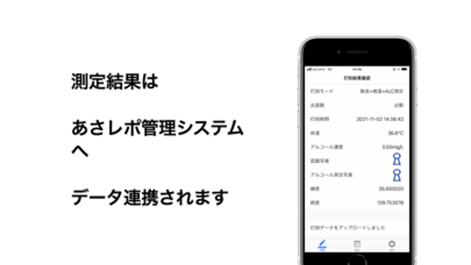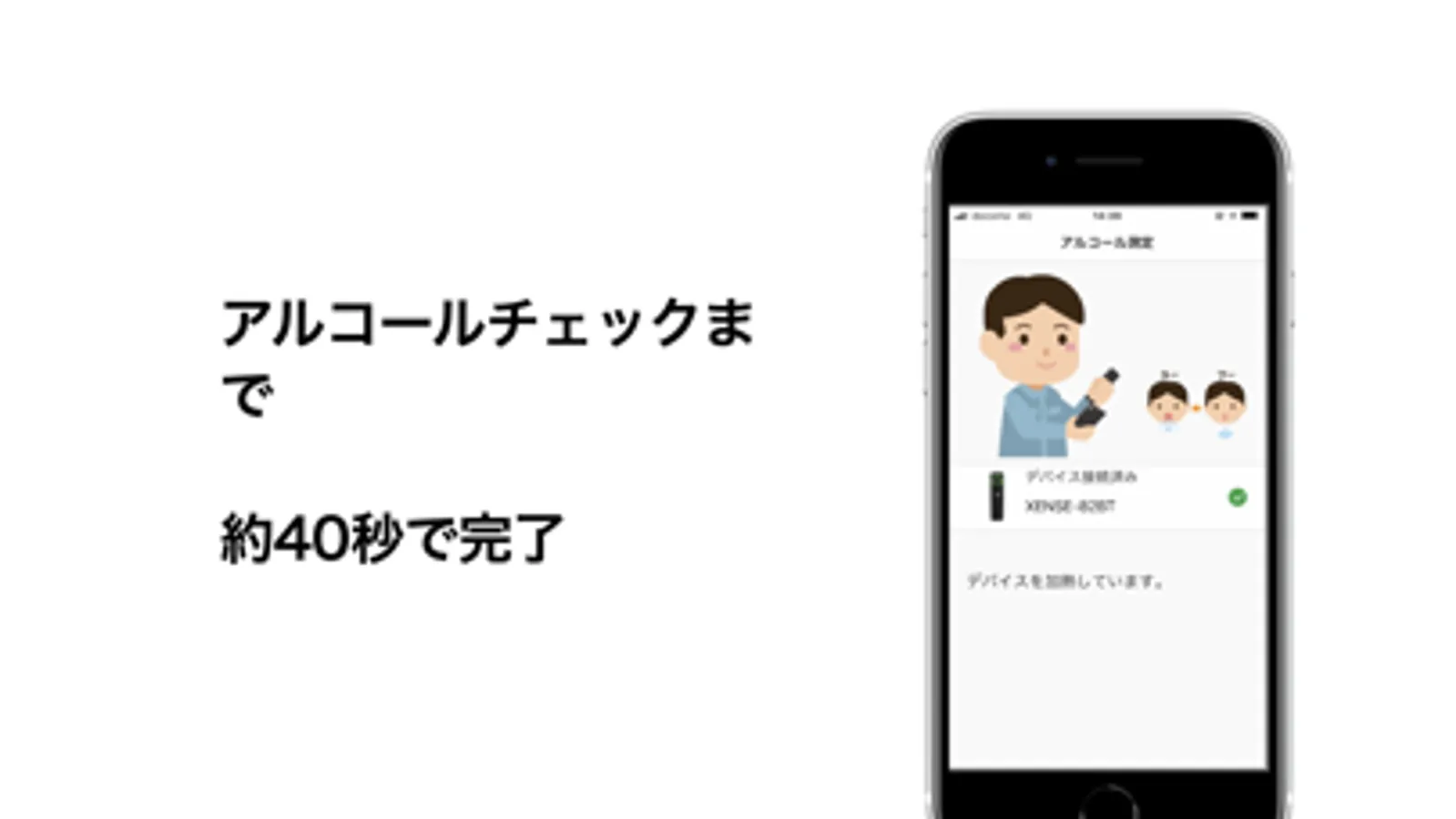 連携する専用デバイスは呼気中アルコール測定と検温の一台二役。連携デバイスの操作はアプリ側で操作が可能です。