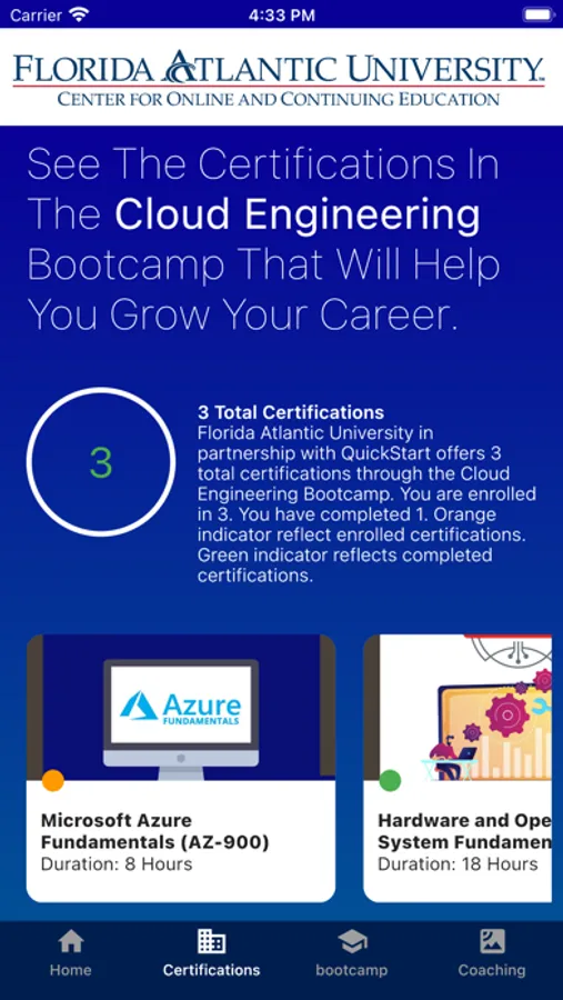 QuickStart's app offers direct access to your bootcamp learning curriculum, including a guide to top certifications, access to course modules and lessons, and even booking one-on-one mentoring sessions (if included in your bootcamp.)