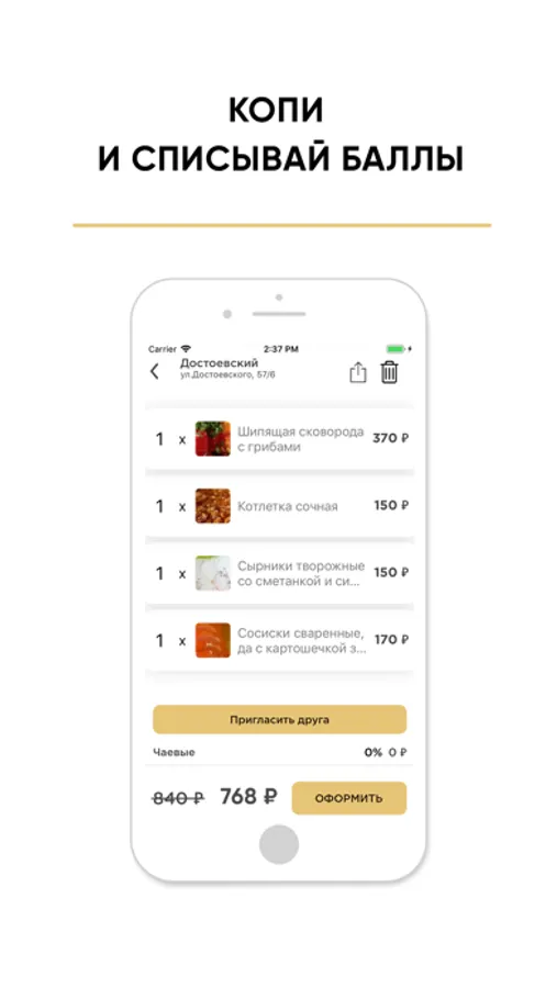 Заказывайте доставку или самовывоз в приложении и получайте кешбэк баллами на следующие заказы. Совершайте заказ без официанта и приходите к накрытому столу!