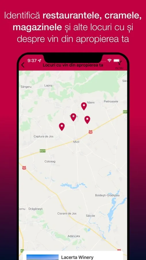• pe hartă, în apropierea ta, vei descoperi numeroase restaurante (care pun accent pe vin și gastronomie), wine bar-uri și wine shop-uri ce îți stau la dispoziție cu liste generoase de vinuri, precum și cu degustări de vin