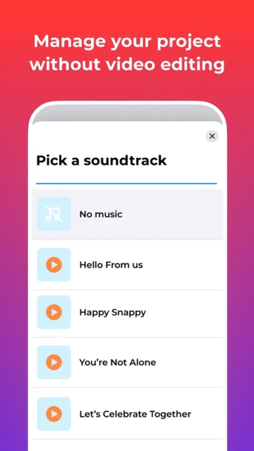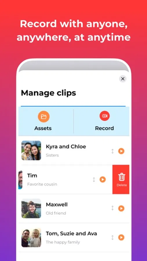 As an organizer you quickly set up projects in the app, invite others with a link, and your participants never need an account to join - just a free download of our app. This way we are able to create 100% consistency and guarantee high definition video recordings. Received all clips? The app auto-generates your final video - just sit back and relax. No editing required.