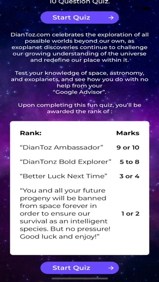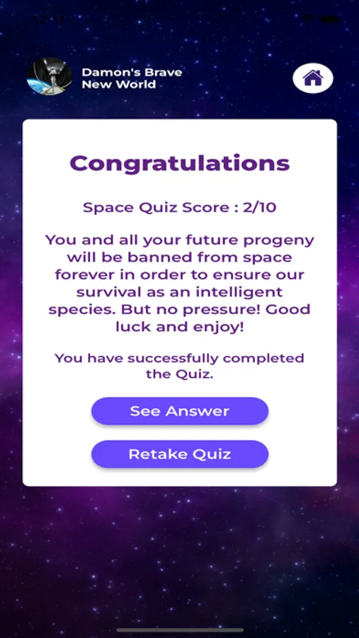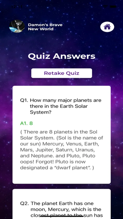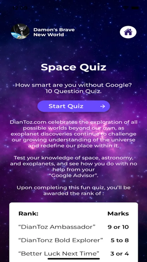 Damon's Brave New World App is a Mobile App for Fellow lovers of Sci-Fi and Science Fiction. Take the fun and interactive Space Quiz to test your Space knowledge, and see where you stand in the space order! Space Quiz is updated periodically, so come back for a new challenge!