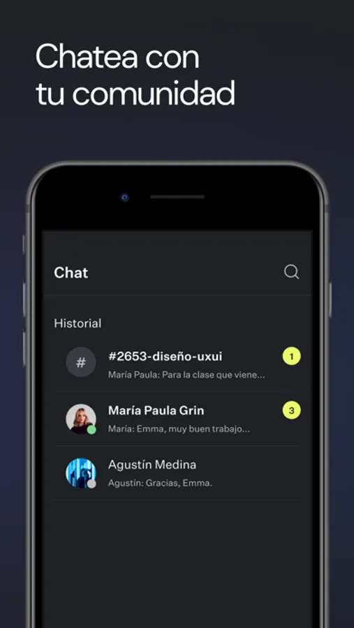 - Chatea con profesores, tutores y otros estudiantes de tu comisión