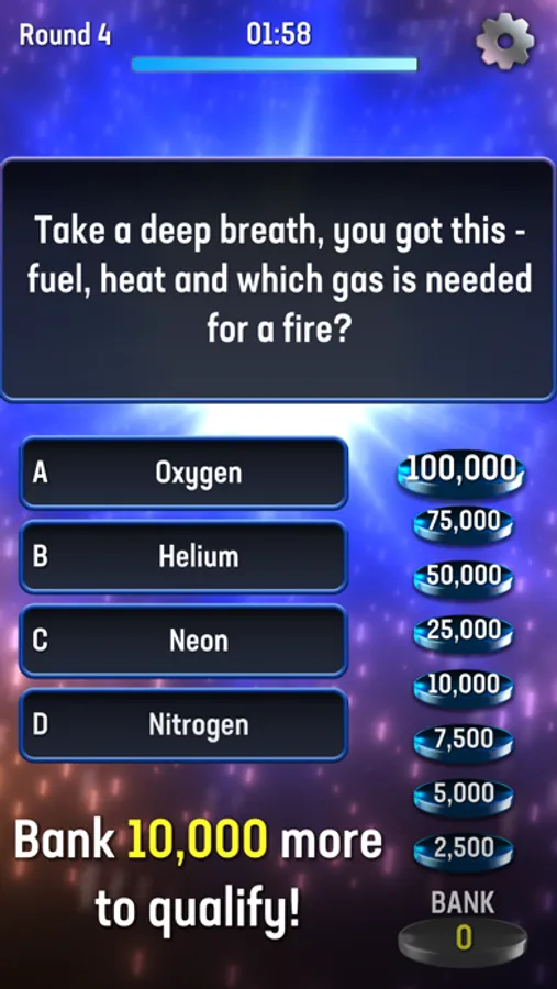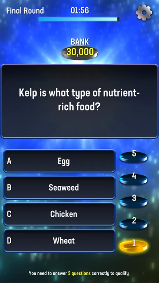 Face questions against the clock across 6 rounds just like the show. Each question moves you up the cash ladder to a bigger amount. Bank your money strategically to hit a qualification target in each round. Get a question wrong before you bank and you lose all the money you’ve built up so far.