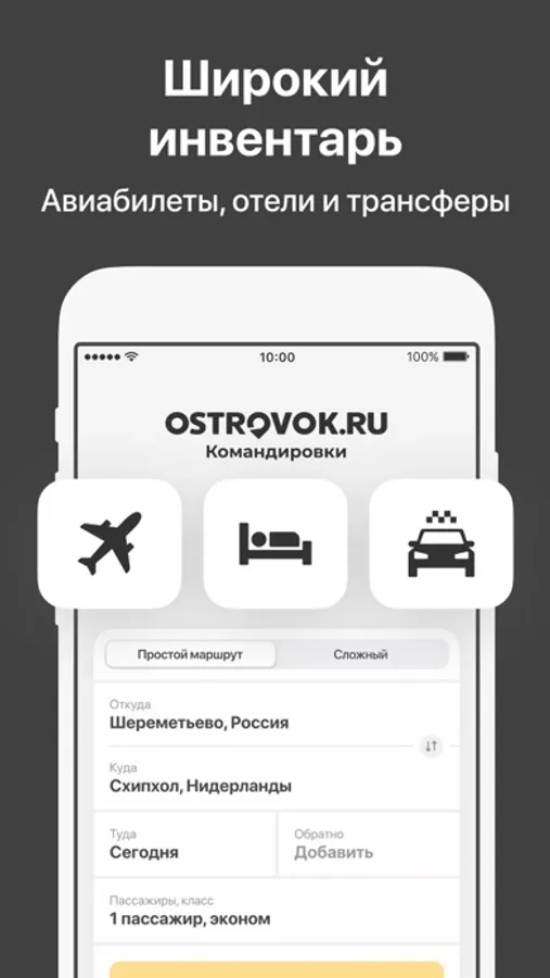 Ostrovok.ru Командировки — сервис для лёгкой организации деловых поездок по специальным тарифам. Более 1,6 млн объектов размещения в 220 странах мира, авиабилеты и трансферы от сотен поставщиков по сниженным b2b-тарифам — вы легко найдёте подходящие варианты под любой бюджет, а моментальная выгрузка отчётности упростит подготовку документации по поездке.