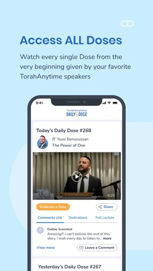 The TorahAnytime Daily Dose App is finally here. Now you have instant access to every single Dose at your fingertips. Be inspired and uplifted with amazing TorahAnytime speakers. Want to watch the full class that the Dose was taken from? A simple tap can get you hooked with inspirational stories and practical takeaway messages.