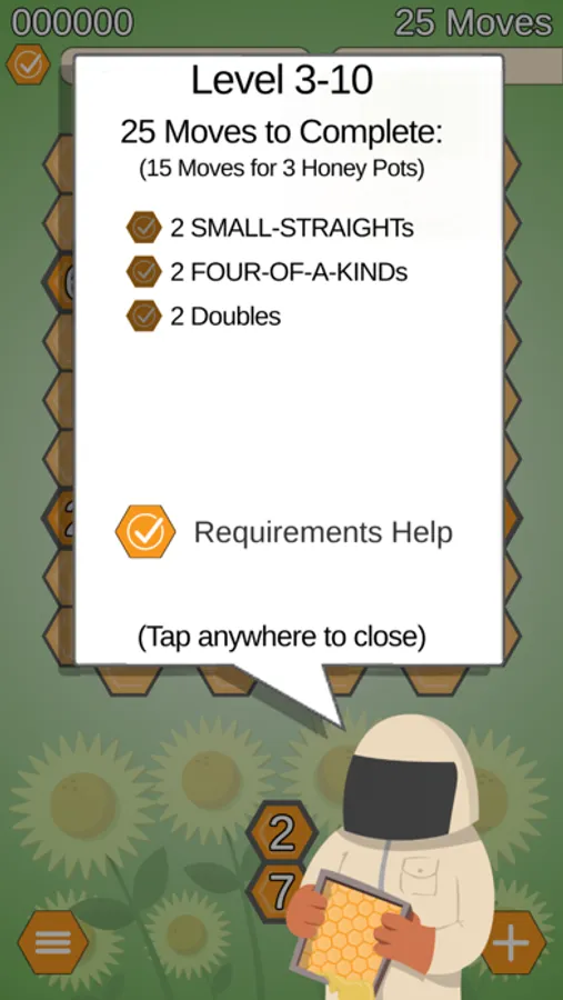 In stage mode play, you must complete each level to complete the stage. Each level has a specific set of requirements that you must meet to complete the level. For example, a level may require you to achieve 2000 points while also completing two 4-of-a-kinds and 1 large straight. Another level may need you to complete two Double scoring events. Each level is unique and presents its own challenges!