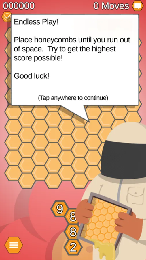 In endless play, you place honeycombs on the hive and try to achieve the highest score possible before you run out of room. Keep playing to try and beat your previous score!