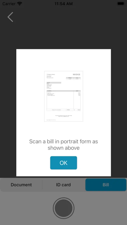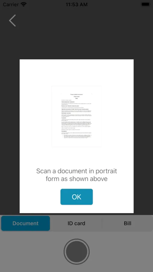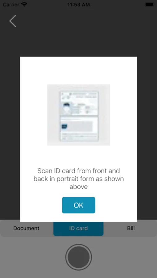 Step 5: You will get an option saying "Scan a document in portrait form as shown above". Click "Ok" and take the image. You can take as many images as you want until the right image is fetched. You can also choose from the option of ID card, Documents, and Bill.
