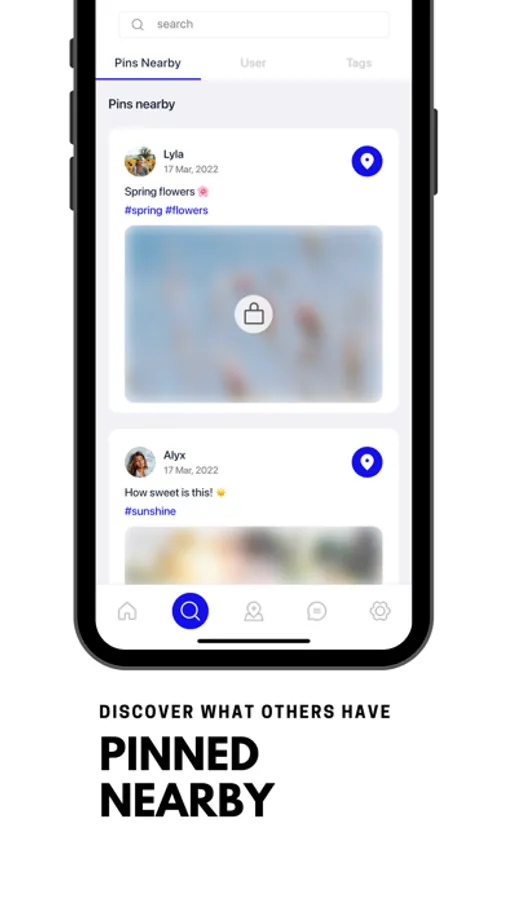 * Search for nearby pins based on tags, dates, and user. These pins will remain blurred until your visit the same location.