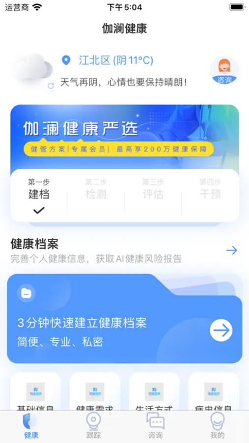 伽澜健康APP是一个以健康行为大数据和人工智能为基础的数字化精准健康管理平台。通过可穿戴设备、主动上报健康数据等方式,为用户提供覆盖全生命周期的个人健康数据动态跟踪、管理,并可为其提供健康趋势分析、风险评估和个性化健康干预方案,为存在健康隐患的用户接入安全、权威、专业、贴心的一站式线上+线下健康干预服务方案,从而实现促进健康、降低疾病风险。
